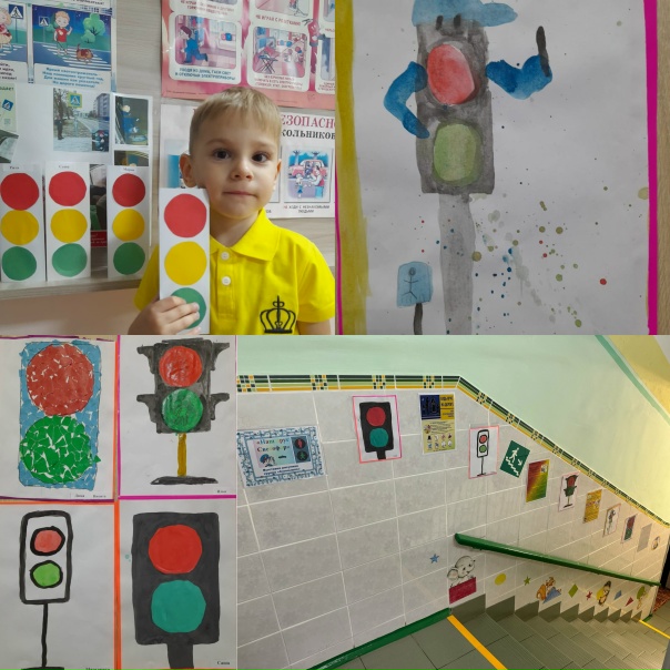 Так же мы занимались творчеством, а именно: аппликация «Мой друг светофор» в детском саду и домашние рисунки совместно с родителями «Светофор- страж порядка». Итогом творческих работ стала выставка в детском саду, она не только радует всех ребят и родителей своей красотой, но и напоминает о важности соблюдения ПДД.