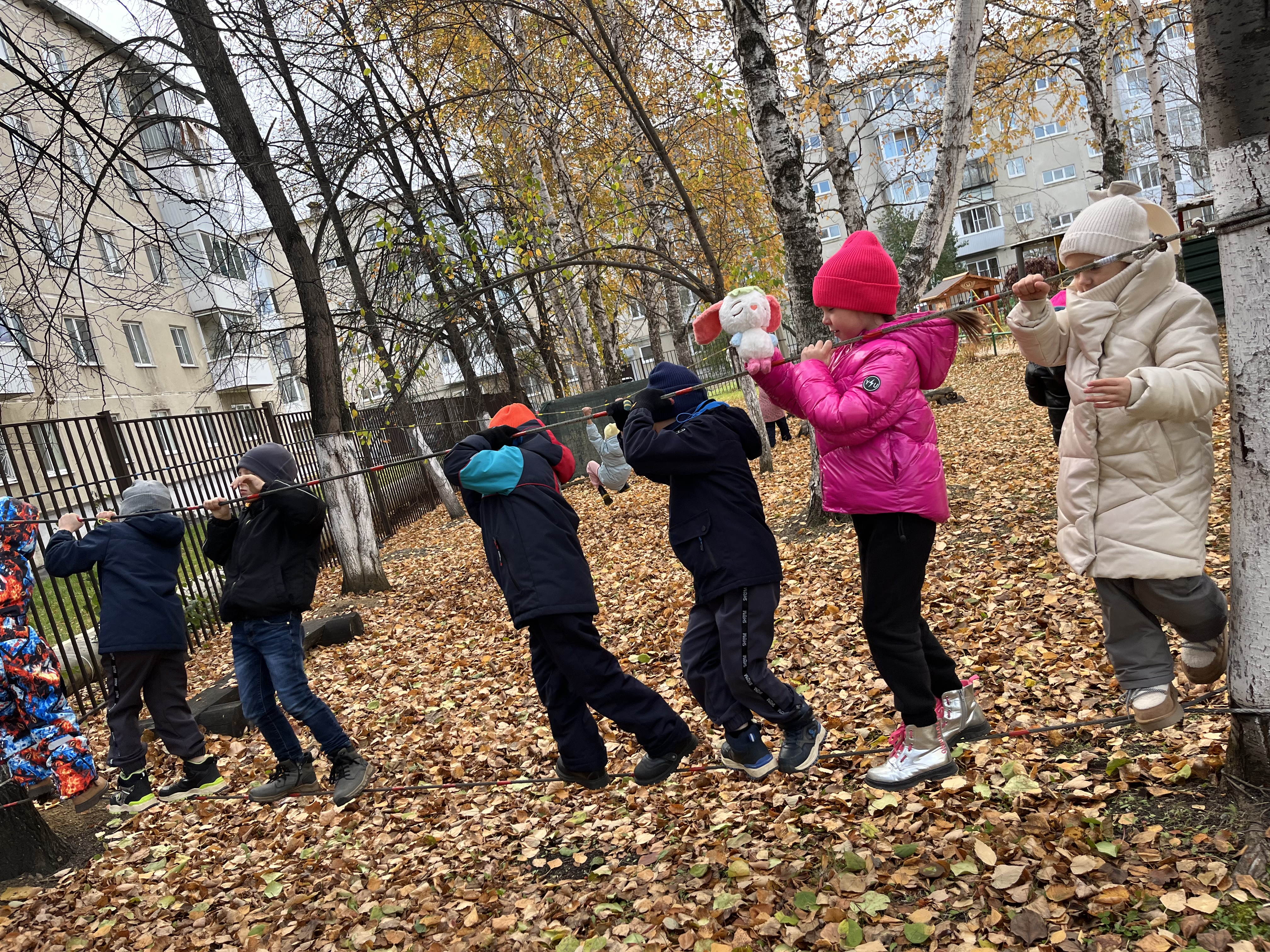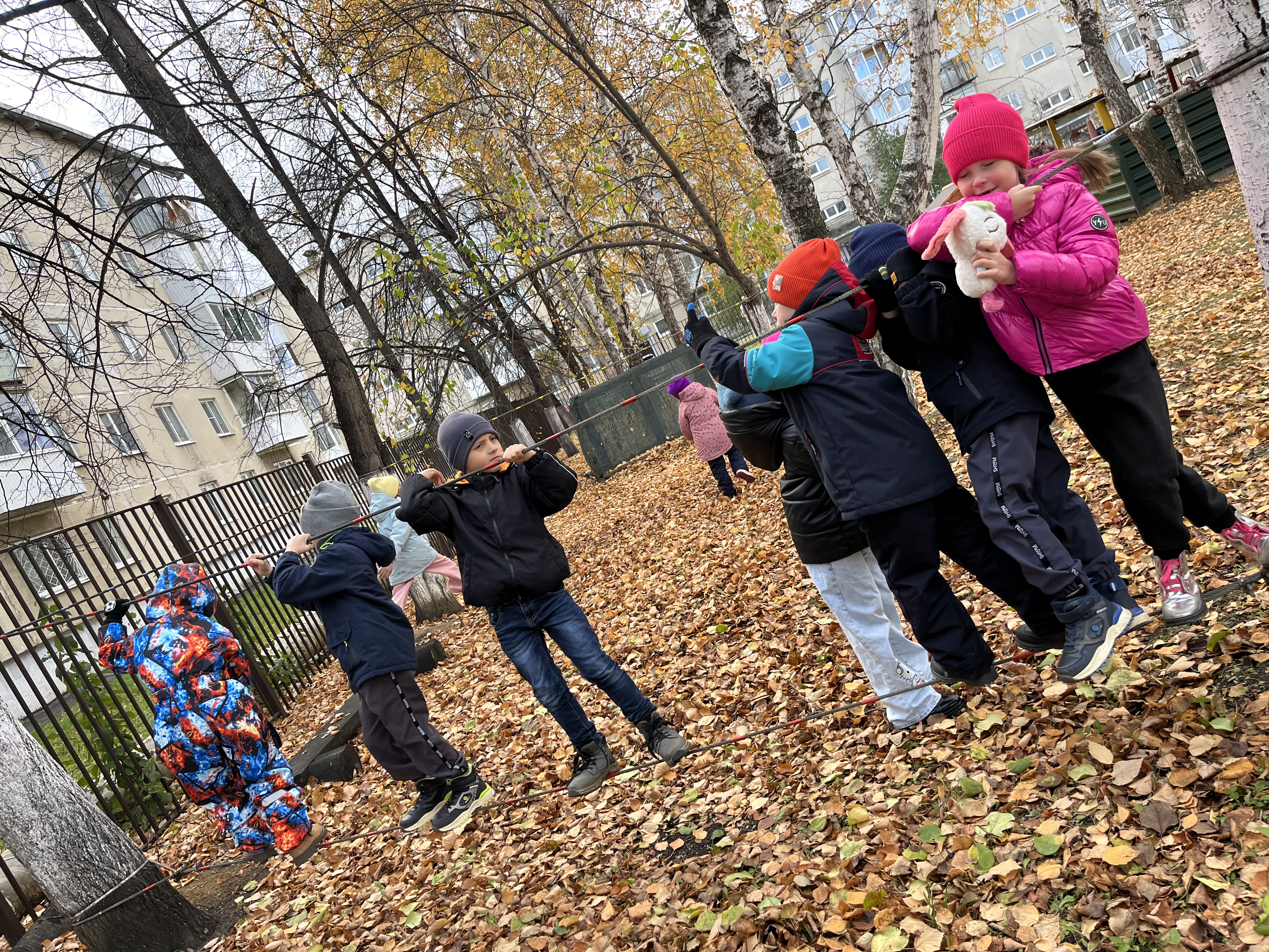 После «посиделок» у костра весело поиграли, потанцевали с листьями, заглянули в шалаш. На обратном пути преодолели полосу препятствий!