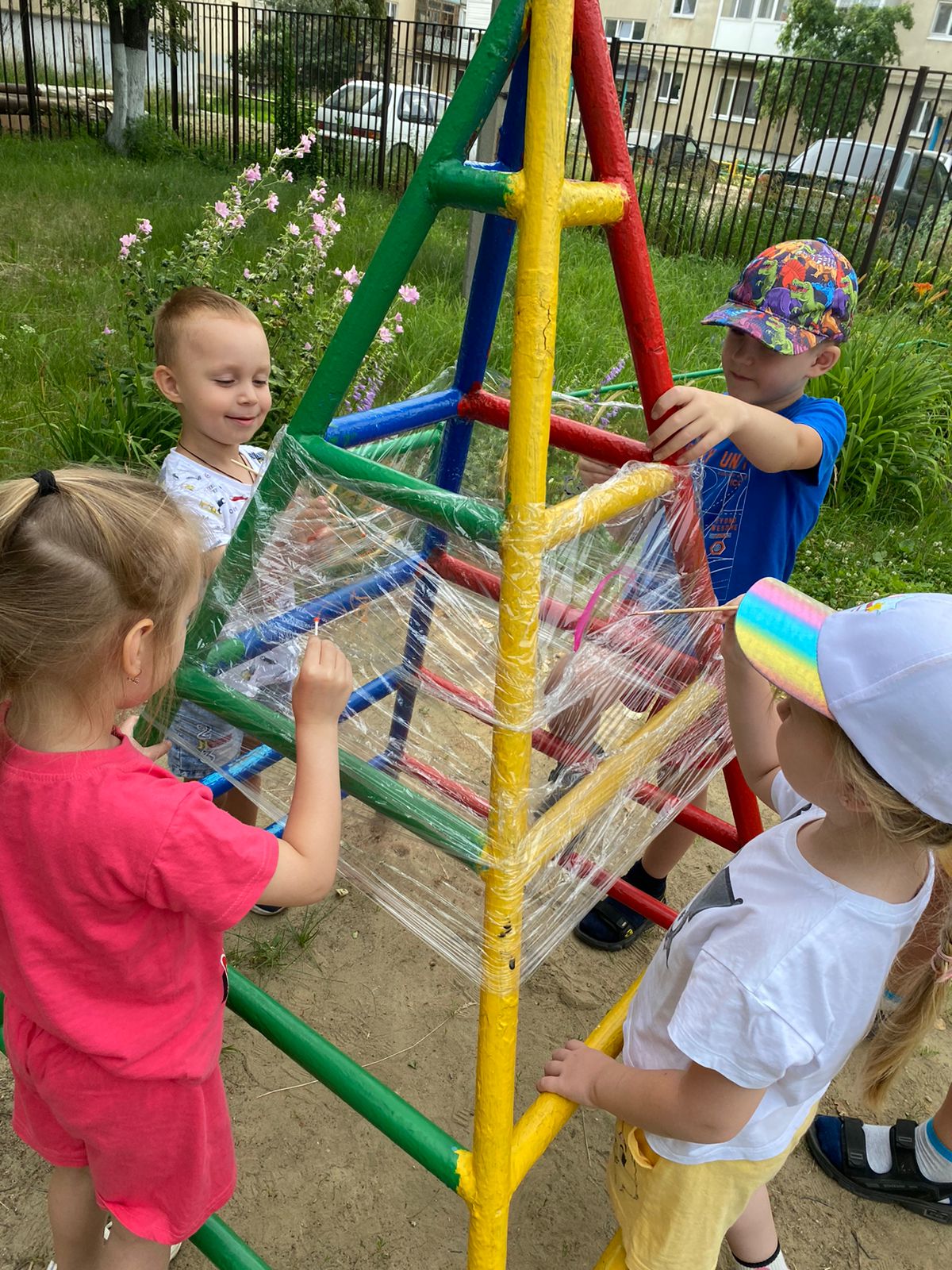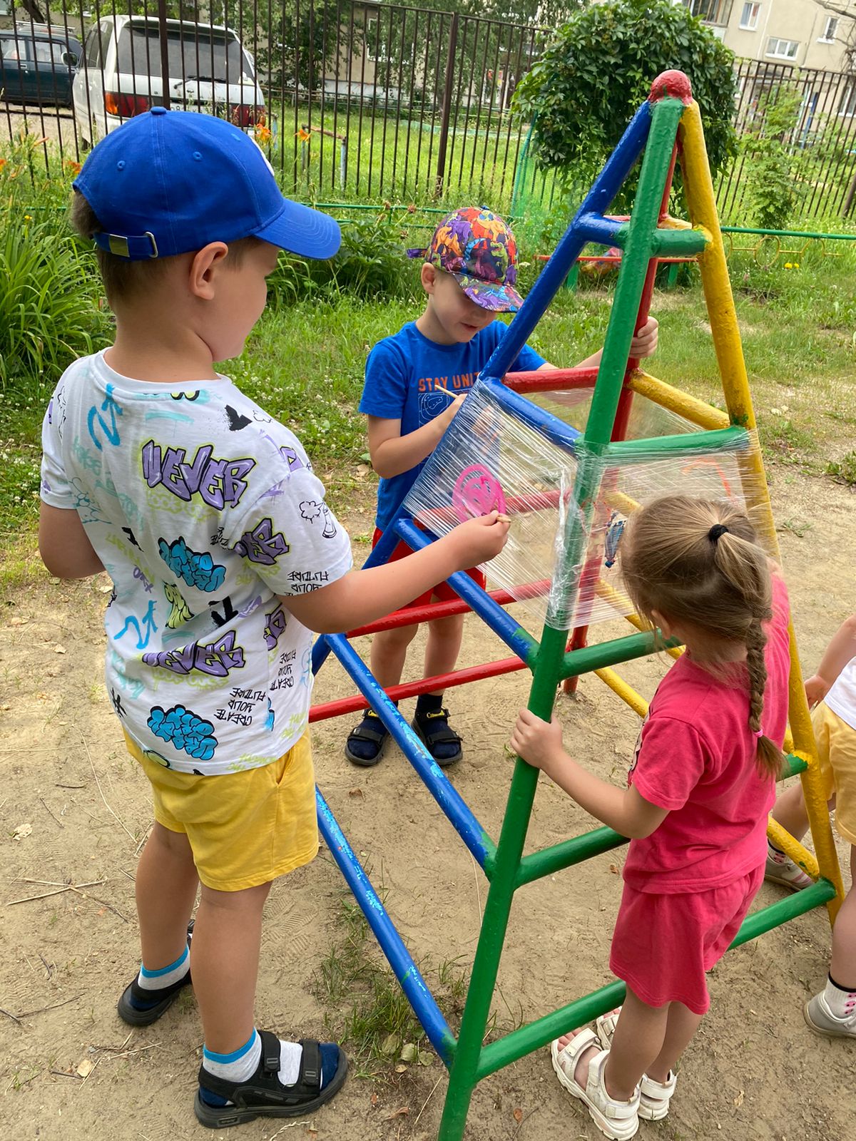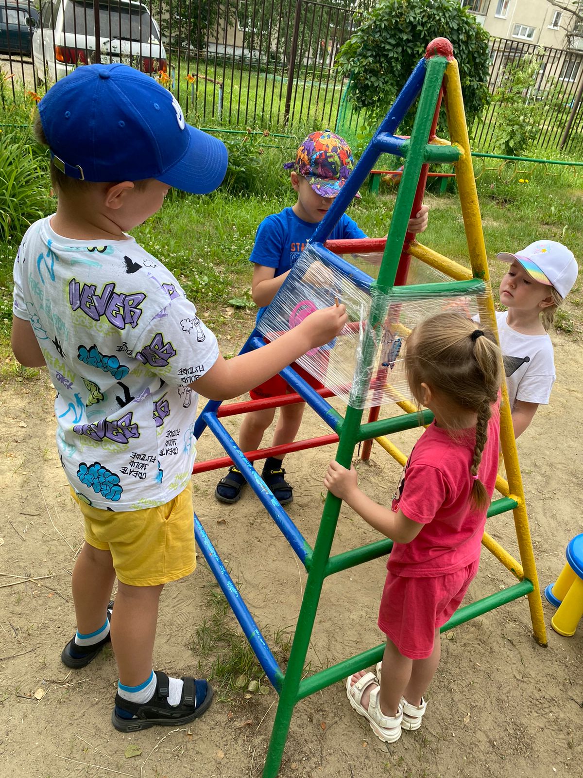 Техника рисования на пищевой плёнке просто волшебная. Эту технику рисования можно использовать на свежем воздухе (летом) на прогулке.